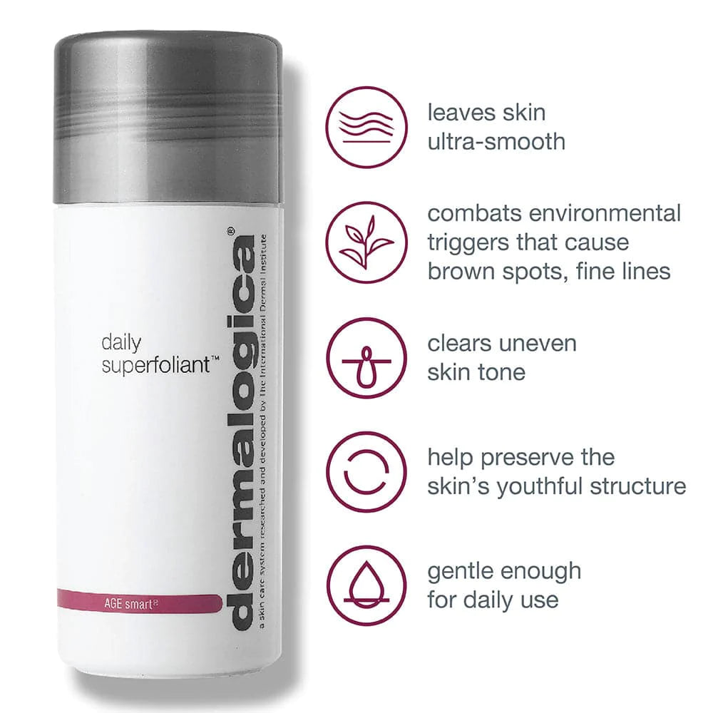 Revitalize your skin with Dermalogica Daily Superfoliant, a potent anti-pollution face scrub. Infused with activated charcoal, this resurfacing exfoliant combats environmental pollutants, deeply cleanses pores, and helps fend off premature aging. Ideal for achieving a smoother, more radiant complexion.